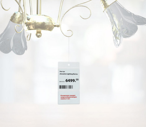 Имеет широкое применение, там где есть необходимость разместить больше информации о товаре. Одежда, кухонная посуда, светильники, люстры, и т.д. В верхней части имеет отверстие для подвешивания.