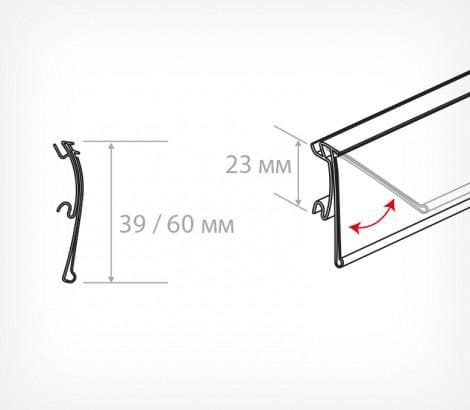 Устанавливается на полки с С-образным профилем на торце: KIFATO, LA FORTEZZA, ALSER и подобных. Гибкое крепление обеспечивает откидывание ценника вверх.