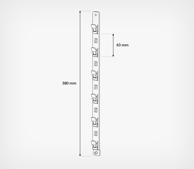 6 пластиковых крючков-фиксаторов расположенных с шагом 63 мм обеспечивают надежное и удобное размещение товаров на ленте. В верхней части ленты предусмотрено отверстие для крепления к топперу или с использованием специального металлического крючка для страйп-лент или хомута.
